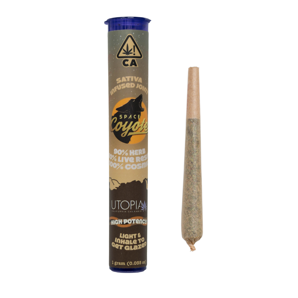 You are in for a treat with Space Coyote's best selling Sativa Live Resin Joint, made in collaboration with Utopia. Be ready for long conversations about the meaning of life, or maybe just about what snack you are going to munchify. Hitting hard as a true Sativa, we experience a feeling of being refreshed, reinvigorated, and pretty damn cosmic.